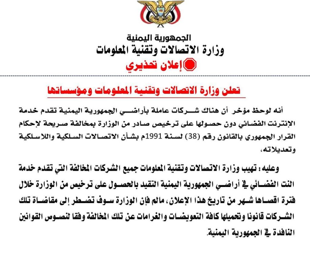 إعلان تحذيري من وزارة الاتصالات وتقنية المعلومات في العاصمة عدن حول الانترنت الفضائي ستار لينك