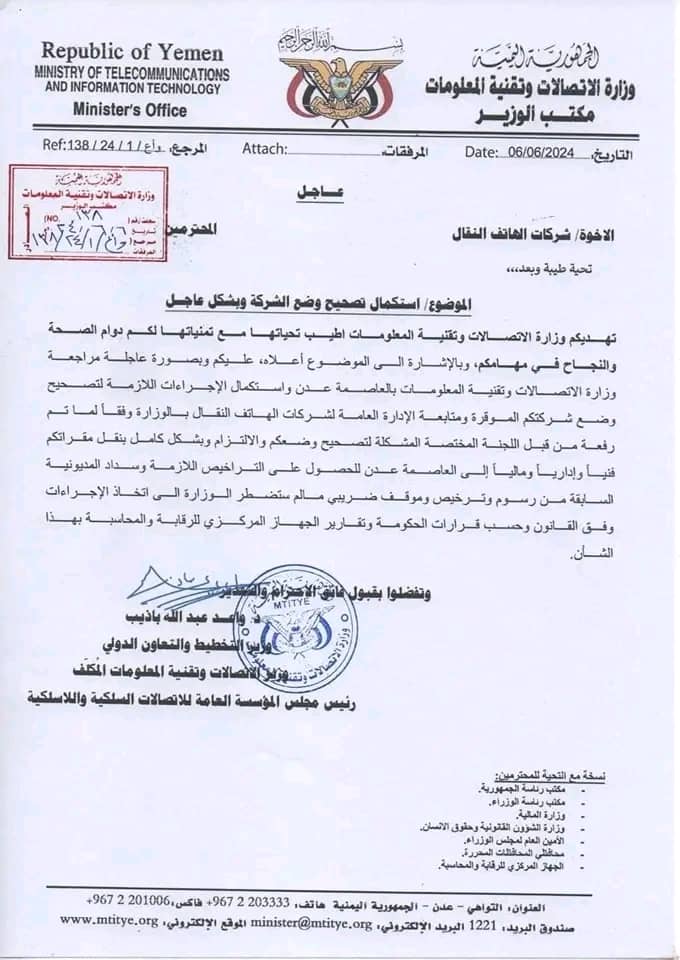 عليهم وبصورة عاجلة مراجعة وزارة الاتصالات وتقنية المعلومات بالعاصمة عدن واستكمال الإجراءات اللازمة لتصحيح وضع شركاتهم الموقرة ومتابعة الإدارة العامة لشركات الهاتف النقال بالوزارة وفقاً لما تم رفعة من قبل اللجنة المختصة المشكلة لتصحيح وضع الشركات والالتزام وبشكل كامل بنقل مقراتهم فنياً وإدارياً ومالياً إلى العاصمة عدن للحصول على التراخيص اللازمة وسداد المديونية السابقة من رسوم وترخيص وموقف ضريبي مالم ستضطر الوزارة الى اتخاذ الإجراءات وفق القانون وحسب قرارات الحكومة وتقارير الجهــاز المركــزي للرقابة والمحاسبــة بهــذا الشــــأن.